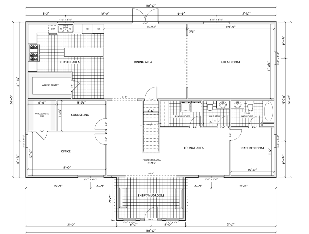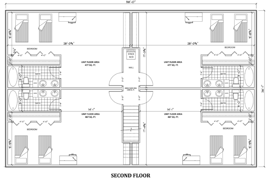 Our blueprints below include housing for four moms and their child. Each will have their own relaxing private 467 square bedroom. This will include a bathroom, large closet, study area and a sitting area they will share with their child. This 6,000+ square foot home will also include a family kitchen, dining area, and living room. It will have a laundry room, a counseling room, an exercise room and a learning center.